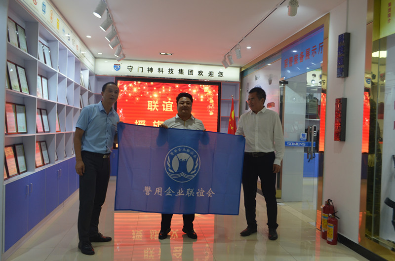 安檢排爆行業聯盟理事長、深圳市天和時代電子設備有限公司董事長李劍波與警用裝備網總經理蘭賜映將會旗授予廣東守門神科技集團有限公司董事長孟昊然,警用裝備網總經理蘭賜映介紹了參加本次聯誼會的企業,對守門神集團的大力支持表示感謝,對警用企業聯誼會的下一步活動進行了預告。