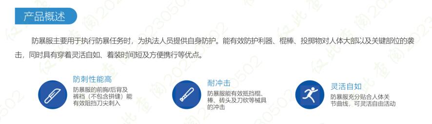 防暴服主要用于執行防暴任務時,為執法人員提供自身防護。能有效防護利器、棍棒、投擲物對人體大部以及關鍵部位的襲擊,同時具有穿著靈活自如、著裝時間短及方便攜行等優點。